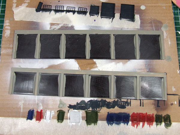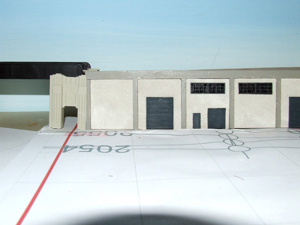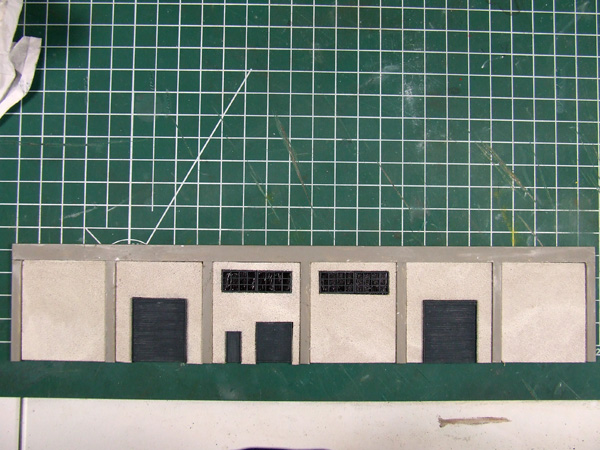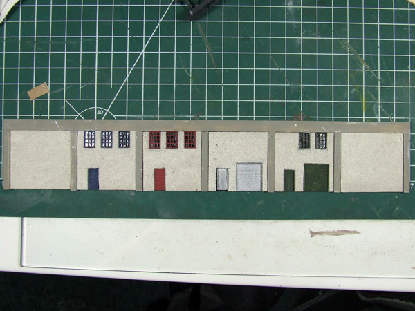 I used styrene strips to make the beams and pillars for the structure of the highline , I then painted sandpaper 180 grid to a stuco color using artists acrylics, cut out the places for the Tichy and Grandt Line doors and windows.