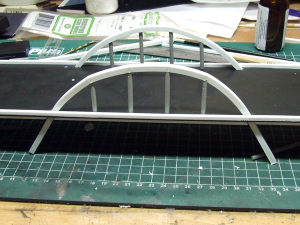 5mm styreen with 3,5 mm holes drilled, then bent through the square holes, 3,5 mm round beams stuck through the holes in the bridge floor into the holes in the 5mm beam.