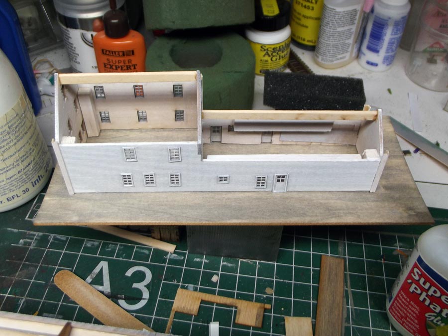 I don't like what the windows , they are just holes in the walls and some acrylic glazing is provided to glue behind those holes, no trimming provided and no real windows , this kit could really use some lasercut windows like the farmhouse has. So I decided to put little doors/shutters in stead of the holes.
