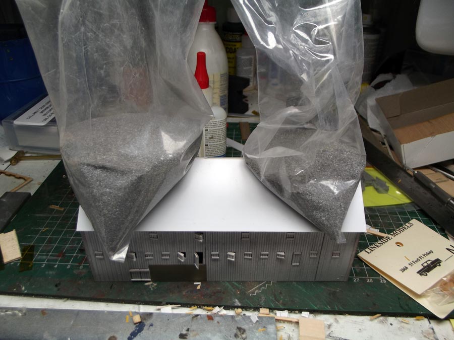 I didn't use the roof wood in the kit , it is wood made to look like a corrugated metal roof, to me that doesn't work, would be a lot better to have corrugated metal roof included in the kit. I'll be doing the corrugated roof myself and the base for this is styrene sheet. Here it is glued down, I use small bags filled with ballast ( or sand ) to hold it down. The bags confirm to the shape of the roof.