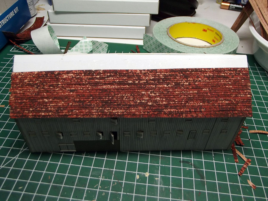 Started installing the rows of shingles, lots of rows of shingles. I use transfer tape to glue these down.