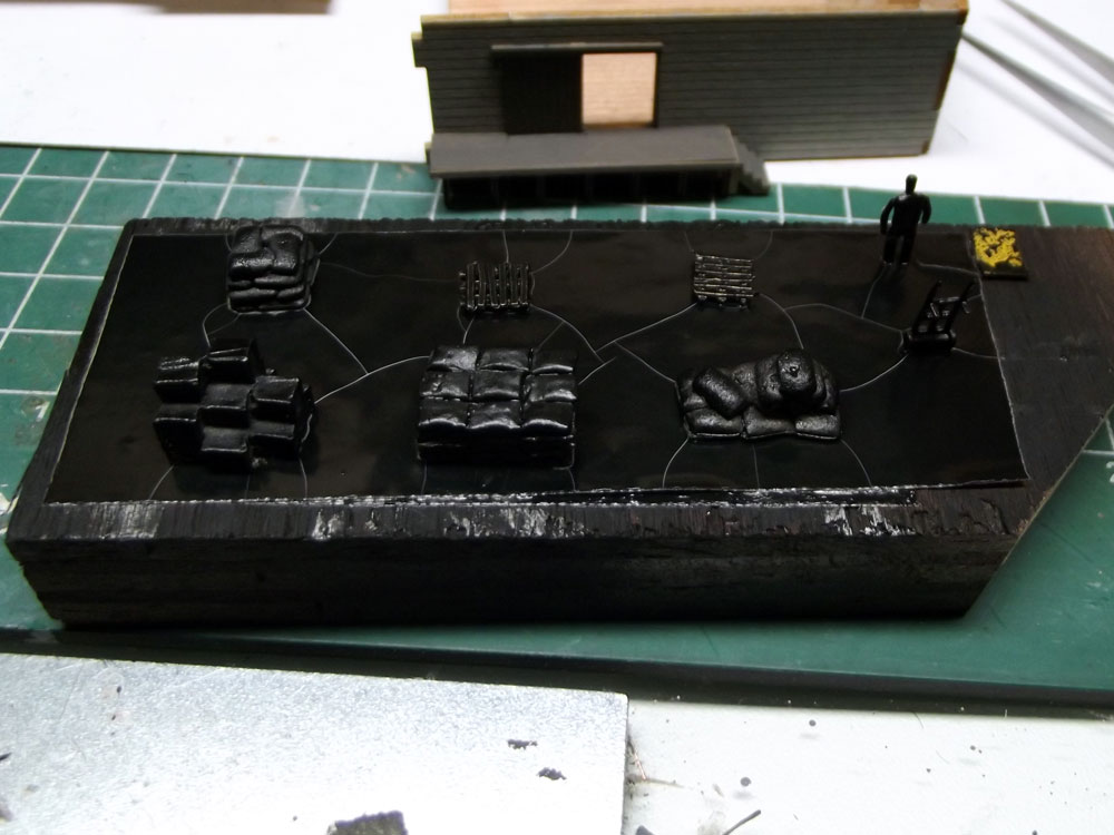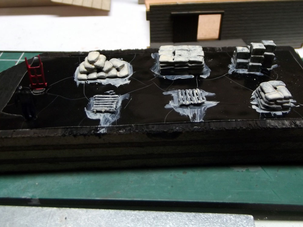 One of the dock doors will be open so I started on some details for inside. Spray painted with primer black, this gives more shadows.