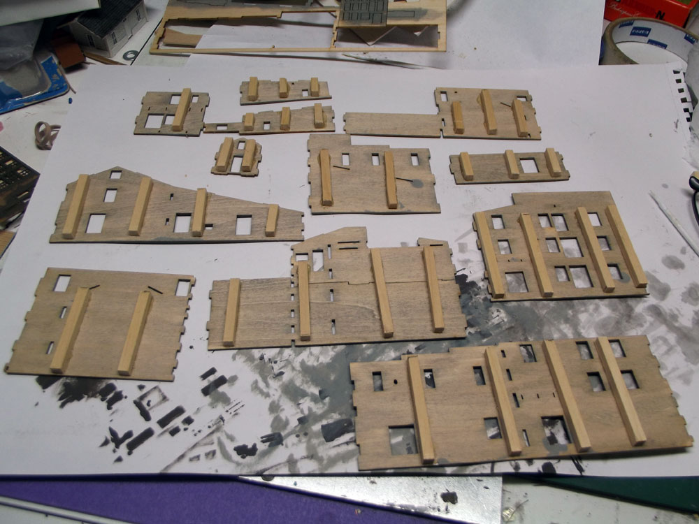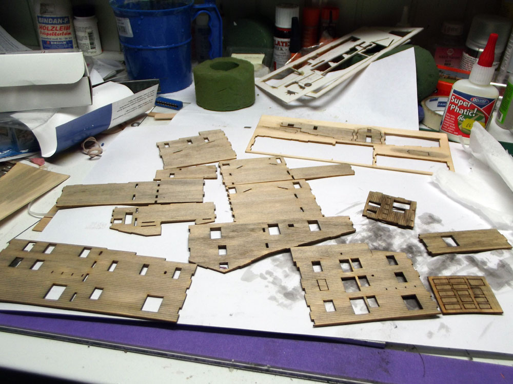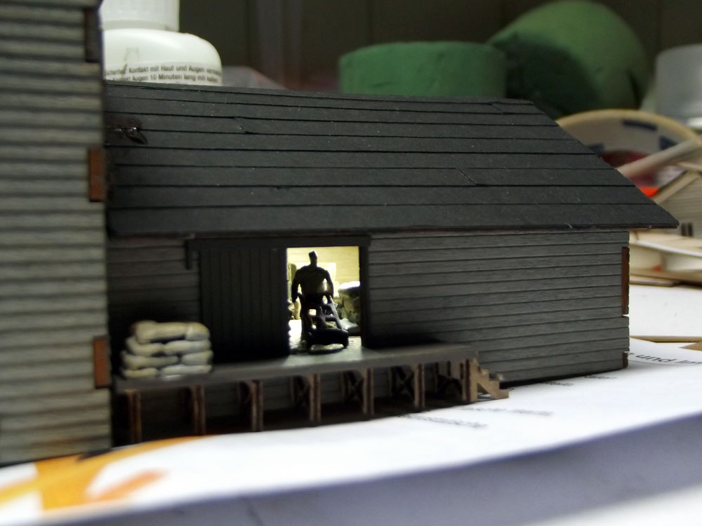 Some pictures of my progress. Including weathering of the roofs with 3 different colors of powders fixed with hair spray. A A base coat of tan paint on the ground , covered with sand while the paint was still wet, after it dryed I shook off the loose sand. Then mounted the structure. Then to cover up where the structure meets the ground I placed some plaster powder tainted with pigments at the edges and colored the ground in spots with this same mixture. Then with a pipet dropped water on it , because of the plaster it was fixed after it dryed.