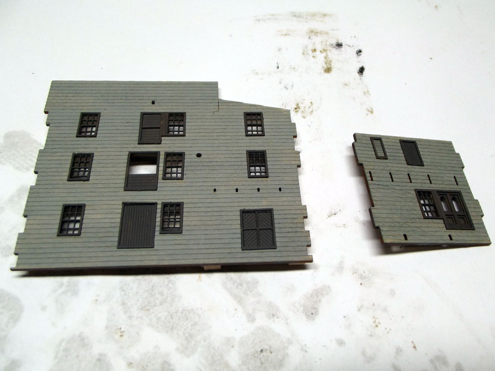 Close up of the first 2 walls done, colors I used are Pollyscale SP Lettering Grey for the walls and GN Empire Green for the doors , windows and trimming.